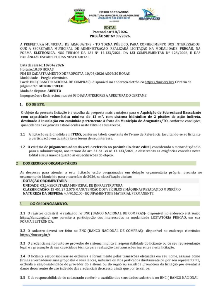 A Prefeitura Municipal de Araguatins, CNPJ/MF sob nº 11.406.326/0001-30, comunica aos interessados que realizará no dia 10/04/2026, às 10:30hs (horário de Brasília), licitação na modalidade Pregão Eletrônico nº PE/2026.09-PMA, tipo menor preço, Objeto: Aquisição de Sobrechassi Basculante com capacidade volumétrica mínima de 12 m³, com sistema hidráulico de 2 pistões de ação indireta, destinado à instalação em caminhão pertencente à frota do Município de Araguatins/TO. Maiores informações se encontram à disposição no portal da transparência no link; https://www.araguatins.to.gov.br/portaldatransparencia/ no sistema https://bnc.org.br/ no PNCP e no endereço acima citado, durante horário de expediente das 07:30 as 13:30. Araguatins, 25 de março de 2026. Railda de Sousa Santos – Agente de Contratação/Pregoeira.