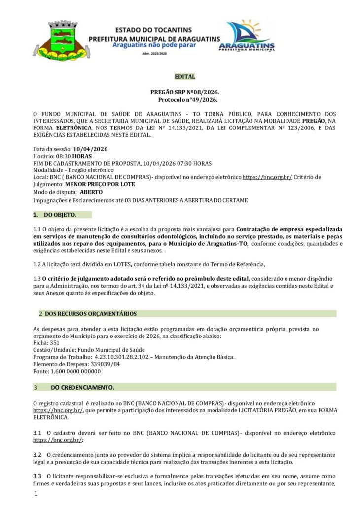 O Fundo Municipal de Saúde de Araguatins, CNPJ/MF sob nº 11.406.326/0001-30, comunica aos interessados que realizará no dia 10/04/2026, às 08:30hs (horário de Brasília), licitação na modalidade Pregão Eletrônico nº PE/2026.08-FMS, tipo menor preço por lote, Objeto: Contratação de empresa especializada em serviços de manutenção de consultórios odontológicos, incluindo no serviço prestado, os materiais e peças utilizados nos reparos dos equipamentos, para o Município de Araguatins-TO.