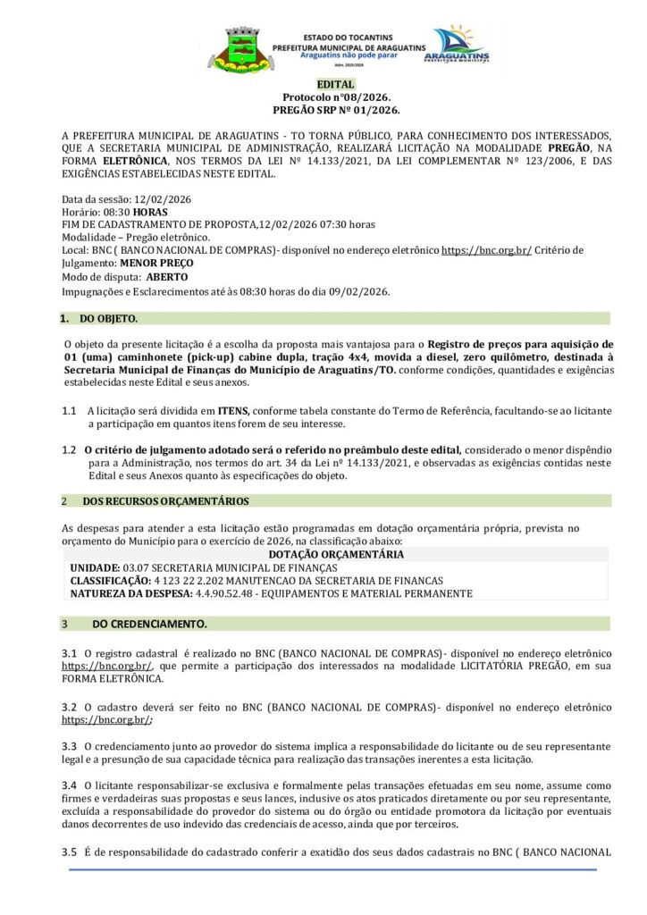 A Prefeitura Municipal de Araguatins, CNPJ/MF sob nº 11.406.326/0001-30, comunica aos interessados que realizará no dia 12/02/2026, às 08:30hs (horário de Brasília), licitação na modalidade Pregão Eletrônico nº PE/2026.01-PMA, tipo menor preço, Objeto: Registro de preços para aquisição de 01 (uma) caminhonete (pick-up) cabine dupla, tração 4×4, movida a diesel, zero quilômetro, destinada à Secretaria Municipal de Finanças do Município de Araguatins/TO. Maiores informações se encontram à disposição no portal da transparência no link; https://www.araguatins.to.gov.br/portaldatransparencia/ no sistema https://bnc.org.br/ no PNCP e no endereço acima citado, durante horário de expediente das 07:30 as 13:30. Araguatins, 30 de janeiro de 2026. Railda de Sousa Santos – Agente de Contratação/Pregoeira.